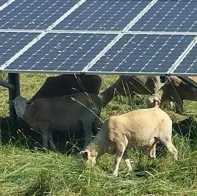 Livestock such as sheep or cattle can graze around solar panels keeping the area mowed and clear, while the panels can provide them with shade and wind protection during inclement weather.